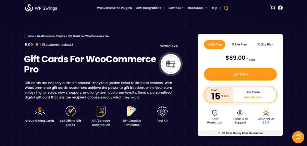 Pricing: Gift Cards for WooCommerce Pro are available in three pricing plans to suit different business needs. It is $89 for a single site, $169 for up to 5 sites, and $329 for up to 10 sites. However, if you’re looking for a free option, you can try the Gift Cards for WooCommerce Lite plugin. It offers essential features to get you started. Pro version for advanced customization, multiple delivery options, and enhanced management tools to maximize your sales potential.